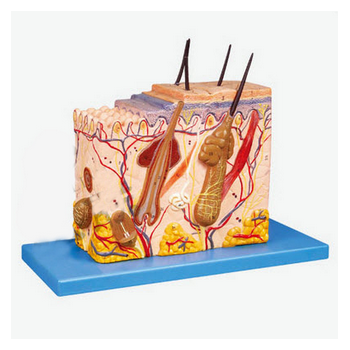 GD/A41002皮膚組織結構放大模型產品介紹:1、該模型由表皮和真皮各分兩部分共4個部件組成,借皮下組織與深層組織相連,并顯示表皮、真皮組織層次結構以及皮下組織和皮膚附屬器(包括毛、皮脂腺、汗腺和神...